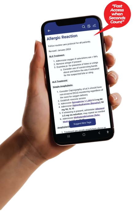 Say goodbye to endless PDFs. Our new tag search lets your staff quickly find protocols by using custom tags. Need STEMI protocols? Just search for the Tag ‘STEMI’ for instant, relevant results—saving valuable time.